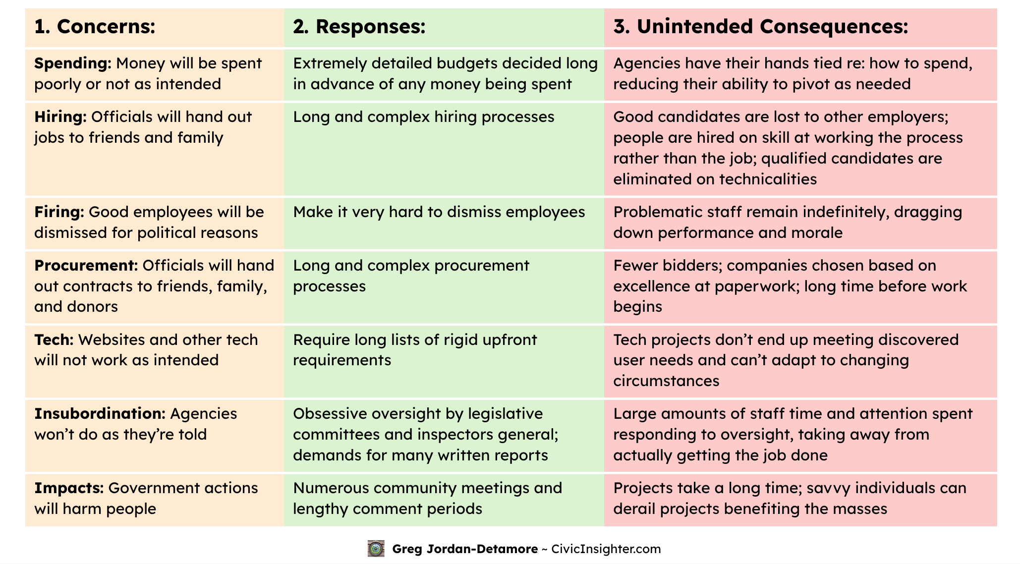 To be clear: We don’t always end up with the worst of these unintended consequences, and there are many challenges in government that have nothing to do with these issues. Still, these are very real issues.