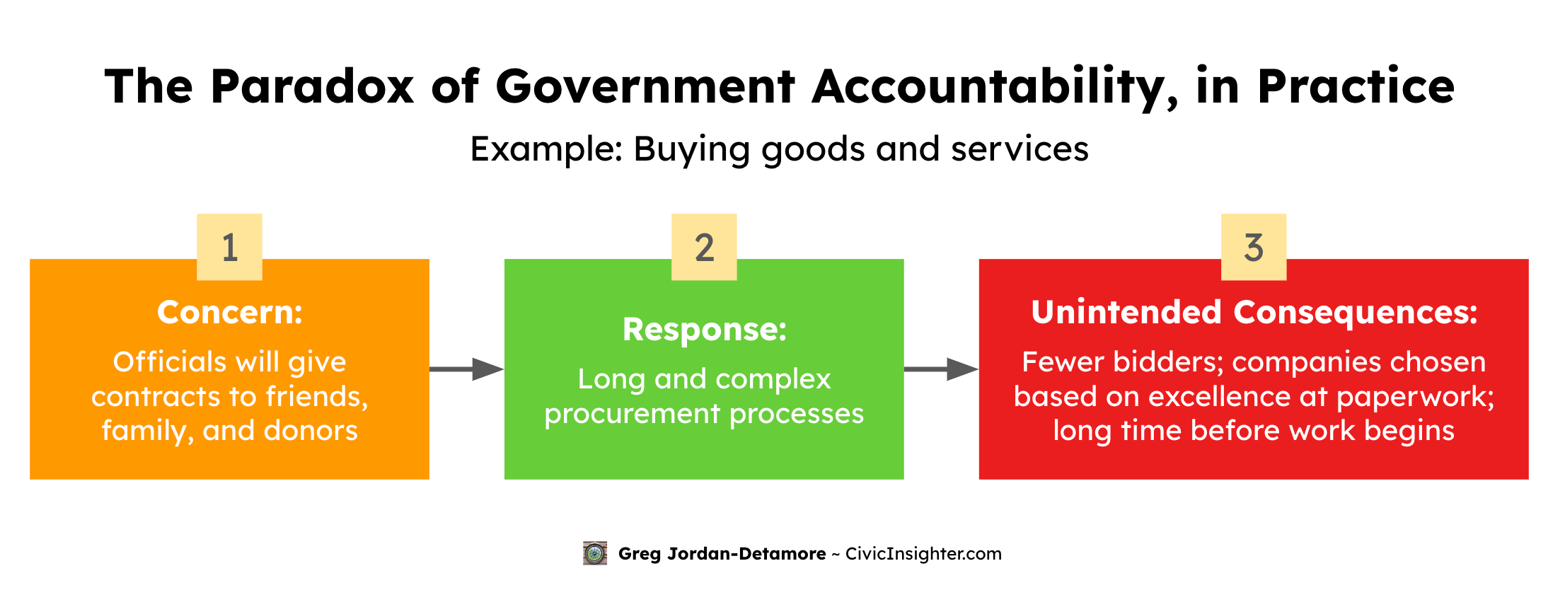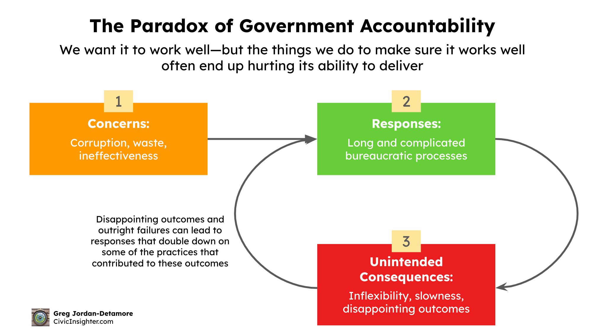 Throughout my career working with governments around the U.S. and elsewhere, I have repeatedly encountered what I now call the Paradox of Government Accountability: Many of the barriers to government efficiency and effectiveness are the result of protections put into place to ensure quality and guard against corruption.